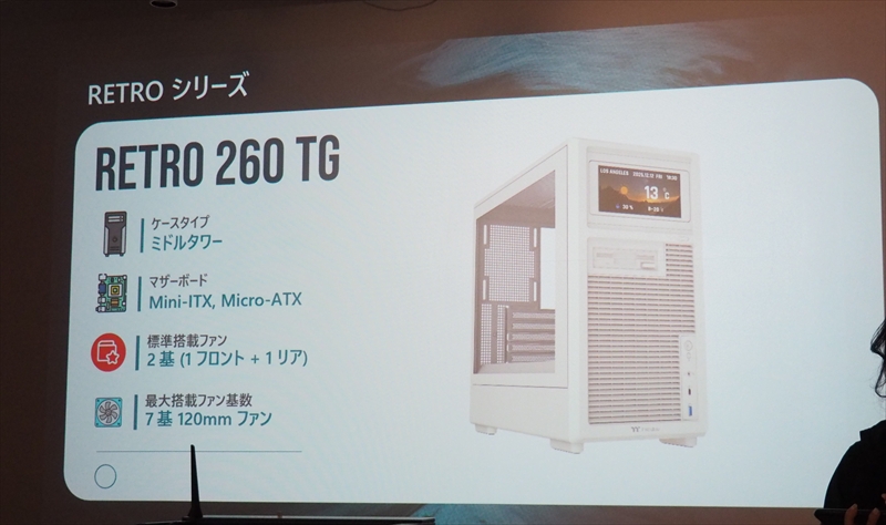 Retro 260 TGは、一回り小さいMicro-ATX対応モデル。最大240mmのラジエーターが搭載可能。実用性はしっかり確保しつつ、レトロな雰囲気はそのままにサイズを抑えたモデルとのこと。