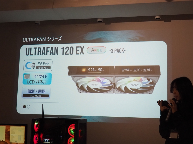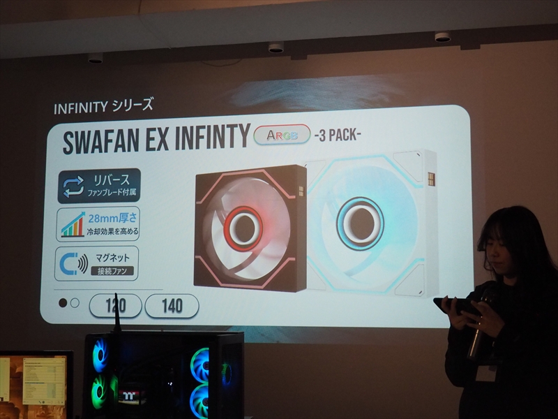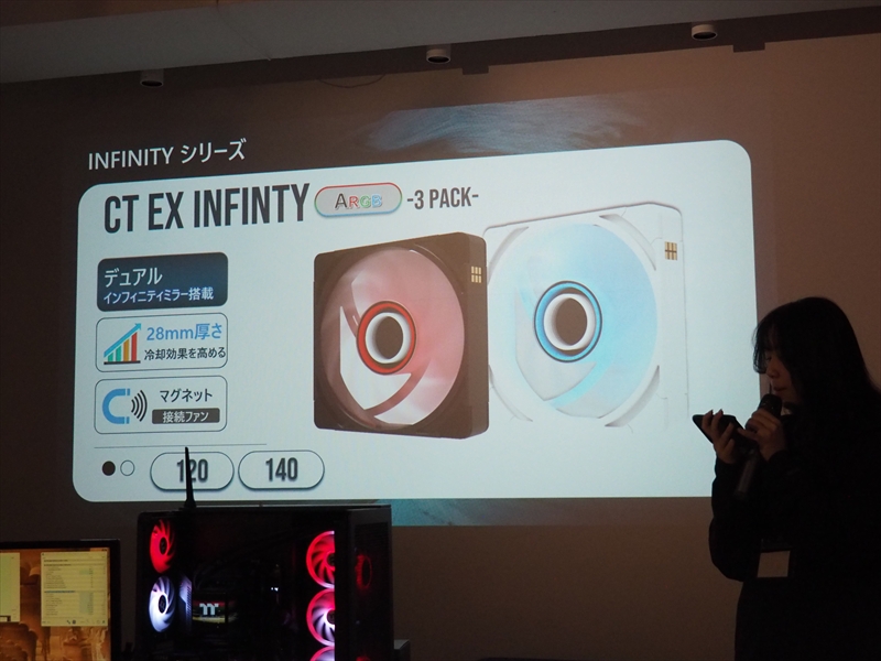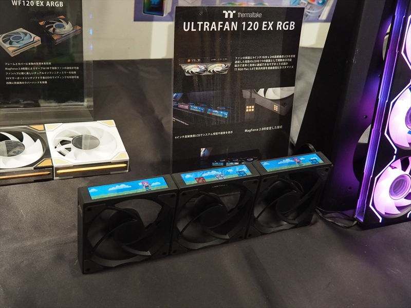 AIOクーラーだけでなく、ケースファンも側面にLCDパネルを搭載した「ULTRAFAN 120 EX」。リバースファンブレードを付属し、ファンブレードを取り換えることで、吸気と排気を切り替えられる「SWAFAN EX INFINITY ARGB」、デュアルインフィニティーミラーを採用した「CT EX INFINITY ARGB」。