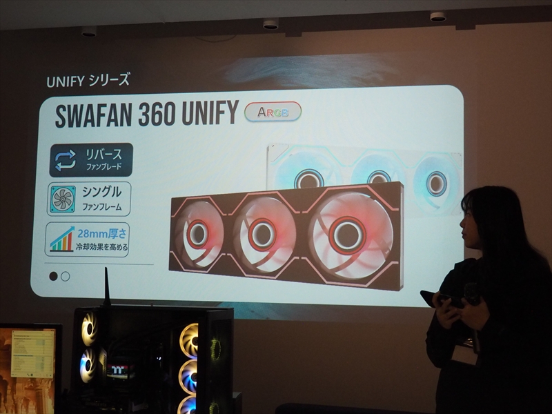 ワンフレームタイプの3連ファン「SWAFAN 360 UNIFY」は、4本のネジで固定可能。組み込み時間がかなり短縮できるほか、配線も少なくすっきりと見せられるとしている。