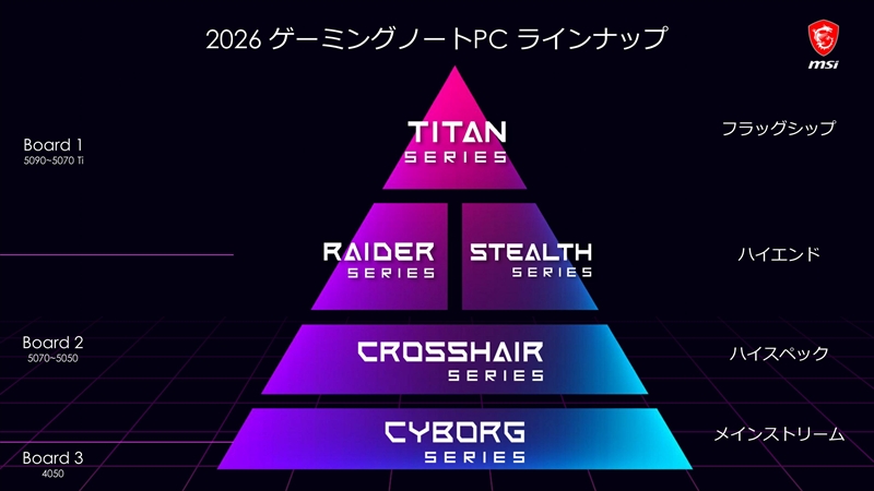 一番上のモデルがフラグシップのTitanシリーズ、ハイエンドモデルは性能重視のRaiderシリーズ、薄型ハイエンドのStealthシリーズ。ハイスペックなCrosshairシリーズ、メインストリームのCyborgシリーズといった構成となっている。