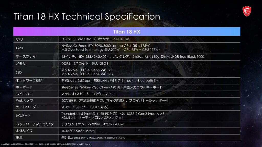 ディスプレイサイズが18インチのモデルは、TitanとRaider、Crosshariで製品展開されるが、日本ではTitanとRaiderのみが発売されるという。18インチモデルは2025年のモデルをベースとしており、Titan 18 HXはCPUにCore Ultra 200HX Plusを採用。GPUはNVIDIA GeForce RTX 5090または5080 Laptop GPUを搭載。