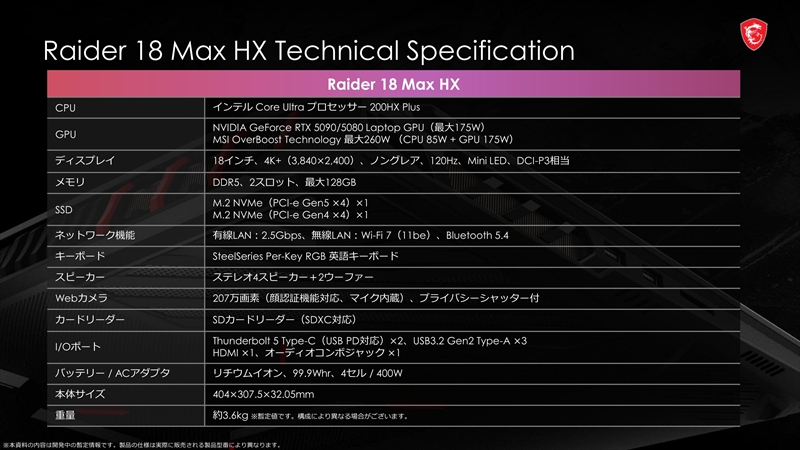 Raider 18 Max HXは、会場には展示されていなかったが、Mini LEDを搭載した120Hz対応の4Kディスプレイを採用している