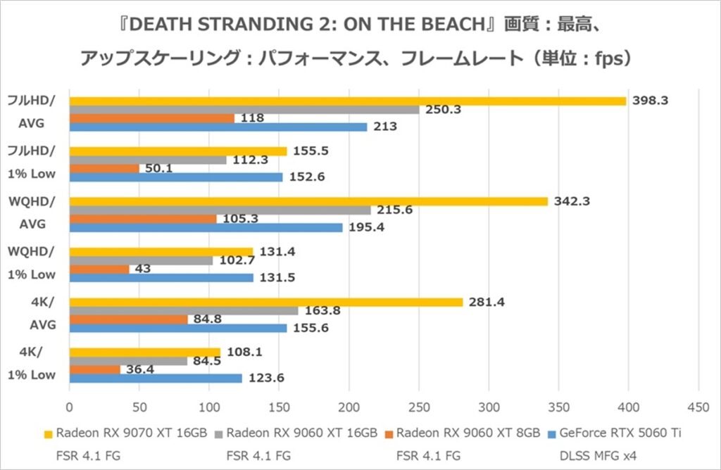 次にGeForce RTX 5060 Tiも加えての比較をしてみた。GeForce RTX 50シリーズは、GeForce Game Ready ドライバー 591.74でDLSS 4.5が使用できる。そして今回の検証では、記事執筆時最新の595.97を使用している。しかし、DLSS 4.5で追加されたマルチフレーム生成(MFG) x6、つまりは6倍のフレーム生成は、デススト2では非対応のためx4が選択でき、CapFrameXで計測した。