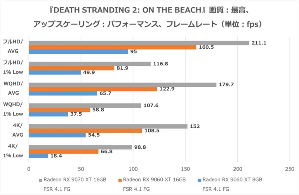 画質が「最高」設定でも、Radeon RX 9070 XTは3840×2160ドットの4K高画質でも平均152fpsと高フレームレートで動作している。Radeon RX 9060 XTもVRAM16GBモデルなら、4Kで平均108.5fps、1% Low Avarageでも66.8fpsと60fpsを超えているため快適に遊べると言えそうだ。実際に画面のカク付きもなく、画面酔いも感じなかった。
