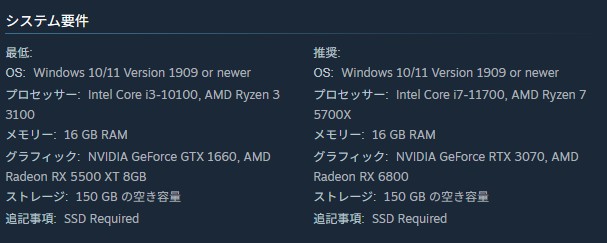 最後にデススト2の動作を複数のビデオカードで確認したい。デススト2のシステム要件は以下のとおり。推奨環境はCPUがインテル第11世代の「Core i7-11700」(8コア/16スレッド、最大4.9GHz)または、コスパも良く市場で長く扱われているAMD「Ryzen 7 5700X」(8コア/16スレッド、最大4.6GHz)。
