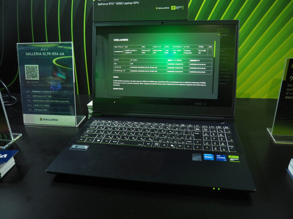 サードウェーブはCPUにAMD「Ryzen AI 7 350」(8コア/16スレッド、最大5GHz)、GPUにNVIDIA「GeForce RTX 5060 8GB Laptop GPU」を備えた「GALLERIA XL7R-R56-6A」を展示。NVIDIA BroadcastによるAIエフェクトで、ビデオ会議の品質を向上させるデモを行っていた。