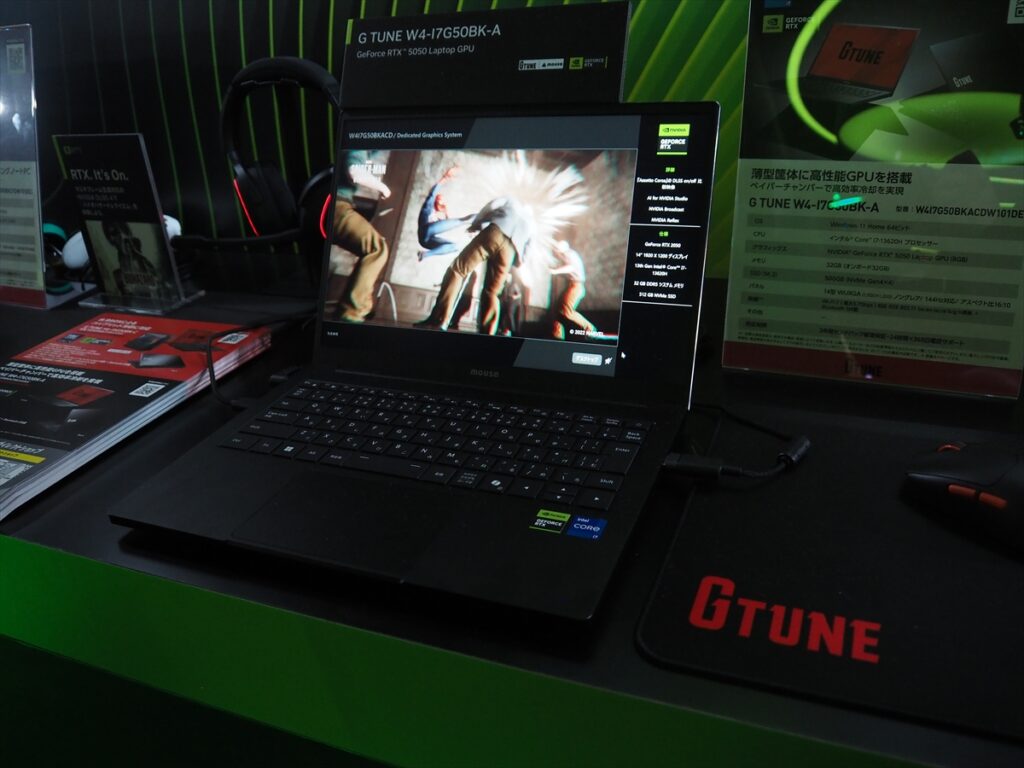 G TUNE W4-I7G50BK-Aは、CPUにインテル第13世代「Core i7-13620H」(10コア/16スレッド、最大4.9GHz)でGPUにNVIDIA「GeForce RTX 5050 Laptop GPU」を備えた 「G TUNE W4-I7G50BK-A」を展示。解像度は1920×1200ドットで、リフレッシュレートが144Hzのノングレアパネル。Wi-Fi 7&Bluetooth 5搭載。