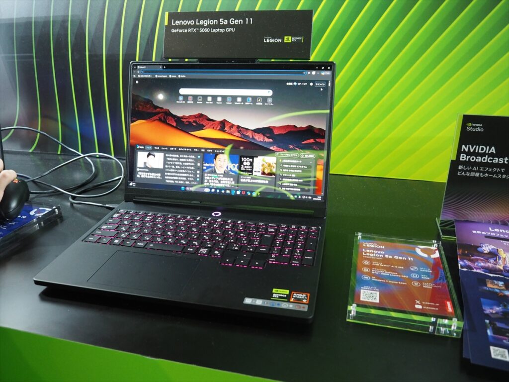 レノボは「Legion 5a Gen 11」「Legion pro 7i Gen 10」と、2つのNPU搭載CPUを備えたCopilot+ PCを展示。会場に展示されていたLegion 5a Gen 11はCPUに総合AI性能が73TOPSのAMD「Ryzen AI9 465」(10コア/20スレッド、最大5GHz)、GPUにNVIDIA「GeForce RTX 5060 Laptop GPU」を搭載。