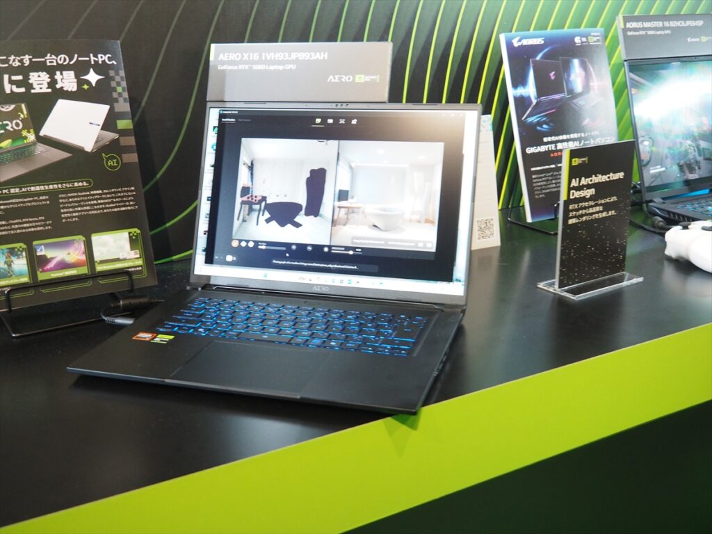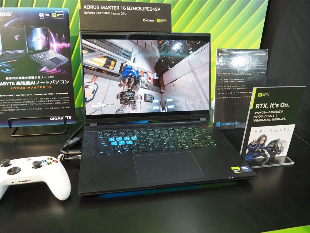 GIGABYTEは、AORUS MASTER 16 AM6Hの「AORUS MASTER 16 BZHC6JPE64SP」と、GIGABYTE AERO X16 EG61Hの「AERO X16 1VH93JP893AH」と2つのゲーミングノートPCを展示。AORUS MASTER 16 BZHC6JPE64SPは、CPUにインテル「Core Ultra 9 275HX」(24コア/24スレッド、最大5.4GHz)、GPUにNVDIA「GeForce RTX 5090 Laptop GPU」を搭載。
