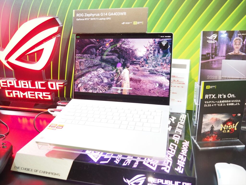 ディスプレイは14インチ(2880×1800ドット)OLEDのグレアパネルで、リフレッシュレートは120Hz。VESA HDR True Black 500やDCI-P3カバー率100%、Dolby Vision、NVIDIA G-SYNCに対応。応答速度は0.2ms。アルミニウムを使用したボディーは最薄部1.59mmと薄型、1.5kgと軽量。会場では『仁王3』がプレイできた。