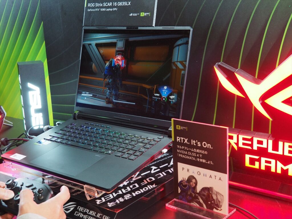ASUSは、「ROG Zephyrus G14 GA403WR」と「ROG Strix SCAR 16 G635LX」の2機種を展示。ROG Zephyrus G14 GA403WRは、CPUに総合AI性能最大80TOPSのAMD「Ryzen AI 9 HX 370」(12コア/24スレッド、最大5.1GHz)に、NVIDIA「GeForce RTX 5070 Ti Laptop GPU」を搭載。