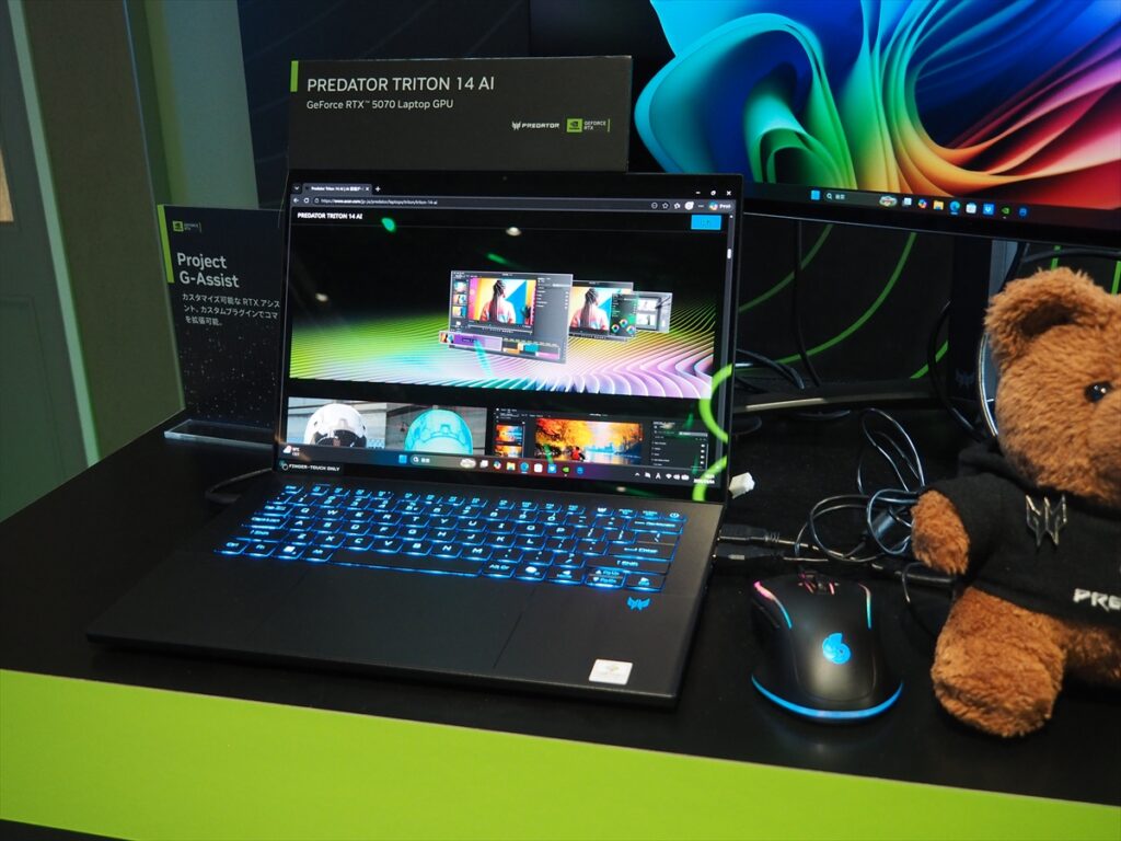 Acerは、「Predator Helios NEO 16S AI」「Predator Triton 14 AI」の2機種を展示。Predator Helios NEO 16S AIは、CPUにNPU性能が50TOPSのインテル「Core Ultra 9 386H」(16コア/16スレッド、最大4.9GHz)と、NVIDIA「GeForce RTX 5070 Laptop GPU」を搭載したCopilot+PC。