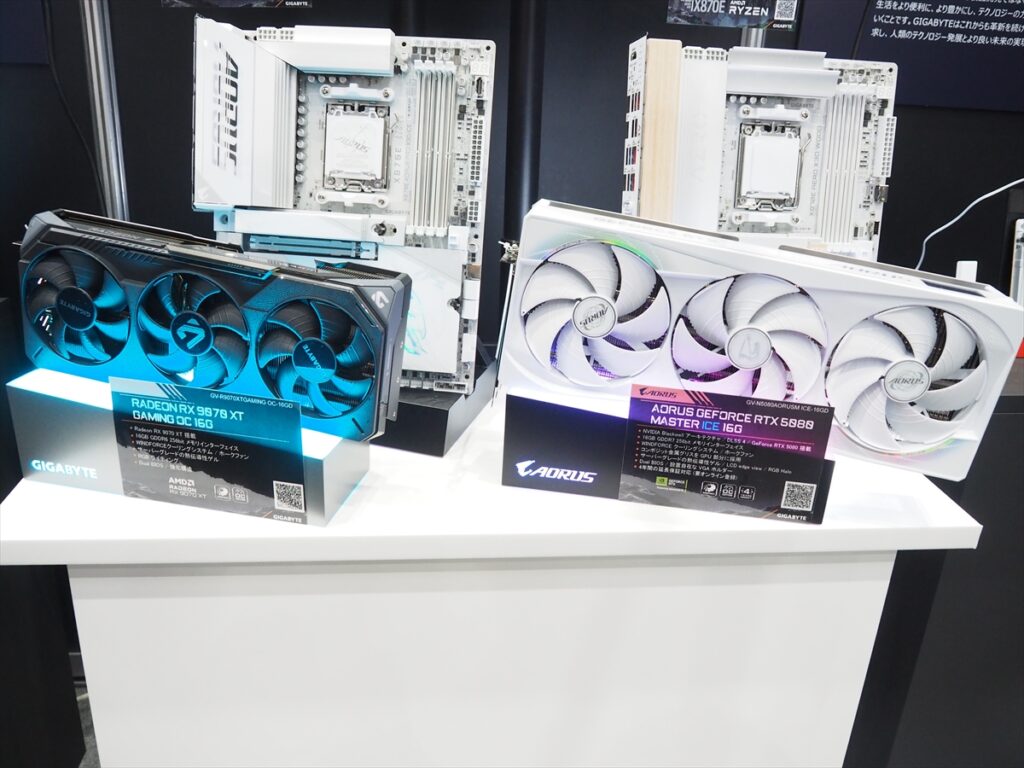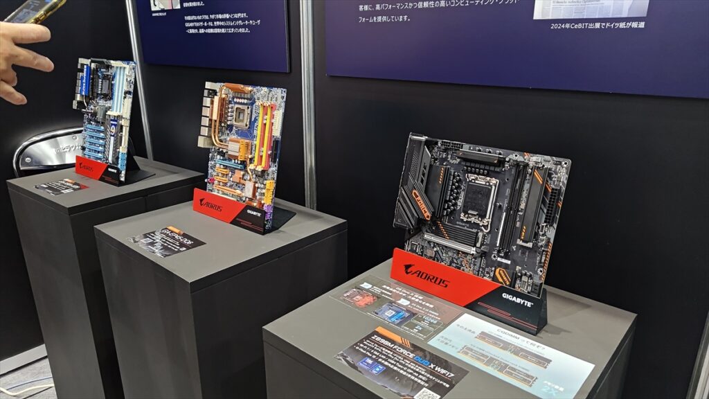 GIGABYTEは、今年で40周を迎え歴史を振り返る2008年発売のLGA775対応マザーボード「GA-EP45-DQ6」、2010年発売のLGA1366対応マザーボード「GA-X58A-UD9」を展示。その横に3月27日に発売したばかりの「Z890M FORCE DUO X WIFI7」を展示していた。