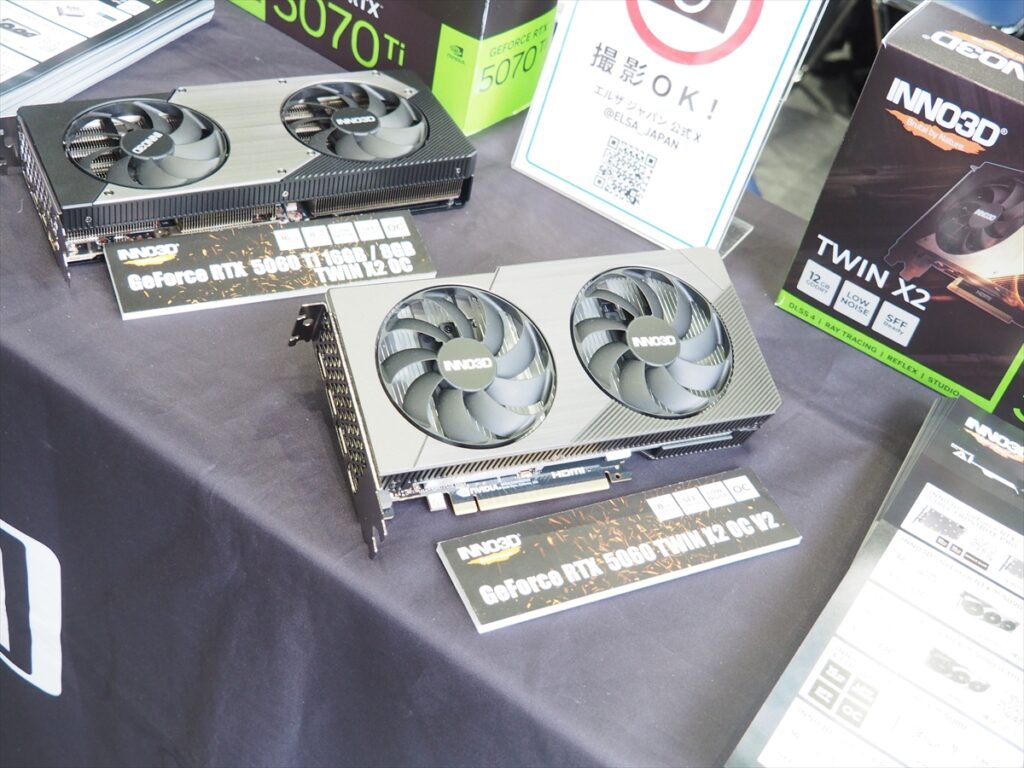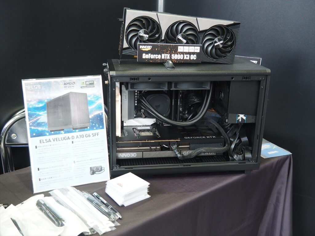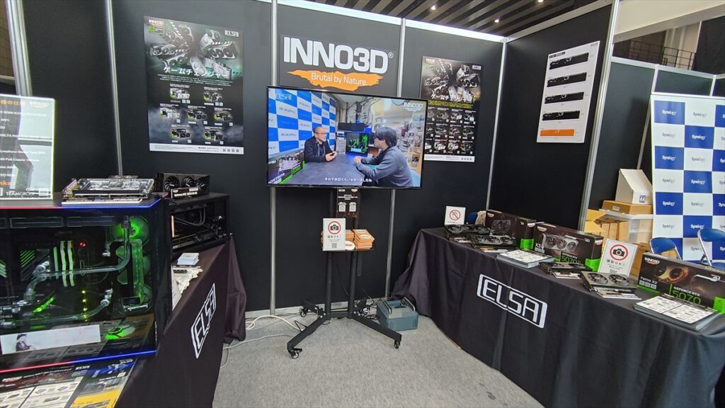 エルザは、昨年の東京ゲームショウ2025にて展示していたオリオスペックとのコラボPCを展示するほか、INNO3Dの最新ビデオカードが展示されていた。