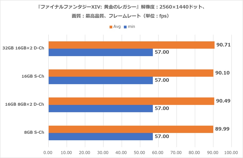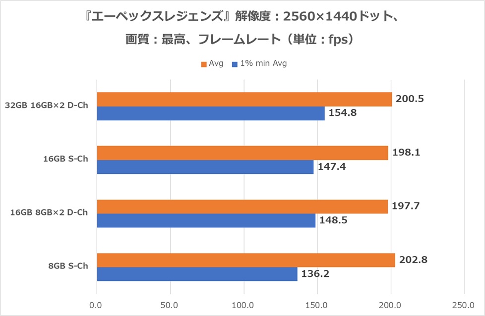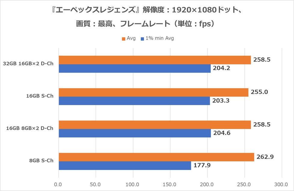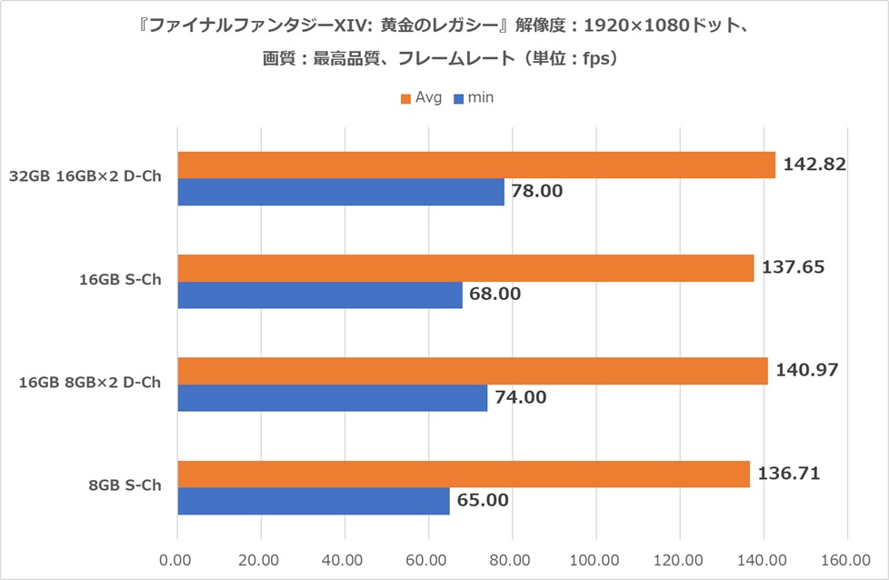 メモリー容量の違いは、フレームレートに大きな影響は与えなかった。ただ、フルHD解像度ではデュアルチャンネル動作のほうが、ゲームプレイに影響する最小フレームレートの”min”が、若干だが伸びている。