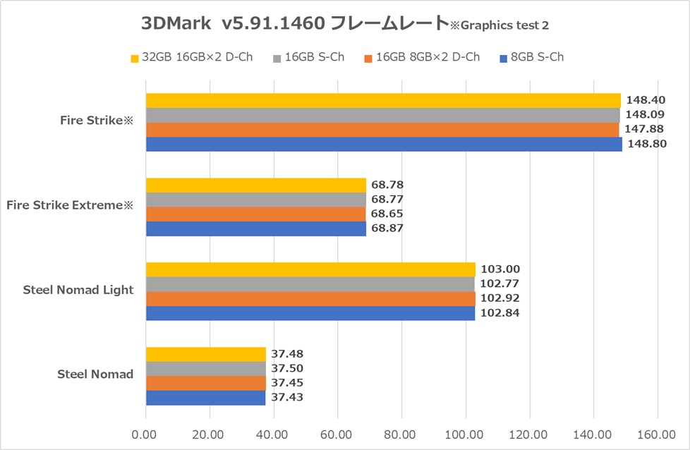 テスト中のフレームレートを抜き出したが、顕著な差はみられなかった。16GBや32GB搭載時は、物理メモリーを9〜10GB程度使用していたが、8GBでも仮想メモリーで顕著にパフォーマンスを下がることはない。