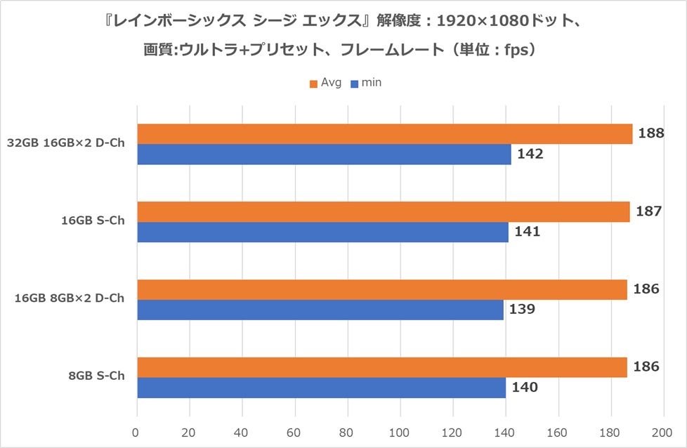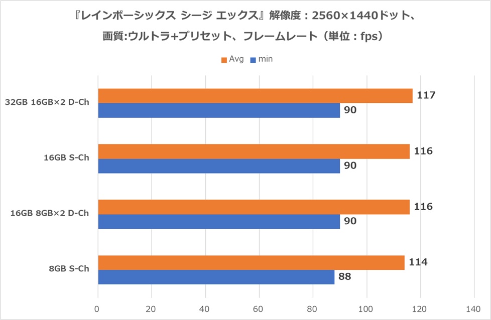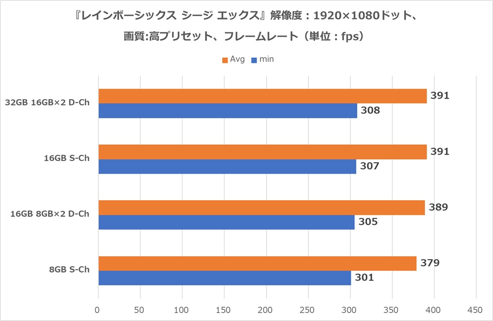 あくまでも内蔵ベンチマークでの結果だが、「レインボーシックス シージ エックス」では、メモリー容量、シングル/デュアルチャンネルによる違いの影響はないように感じられた。