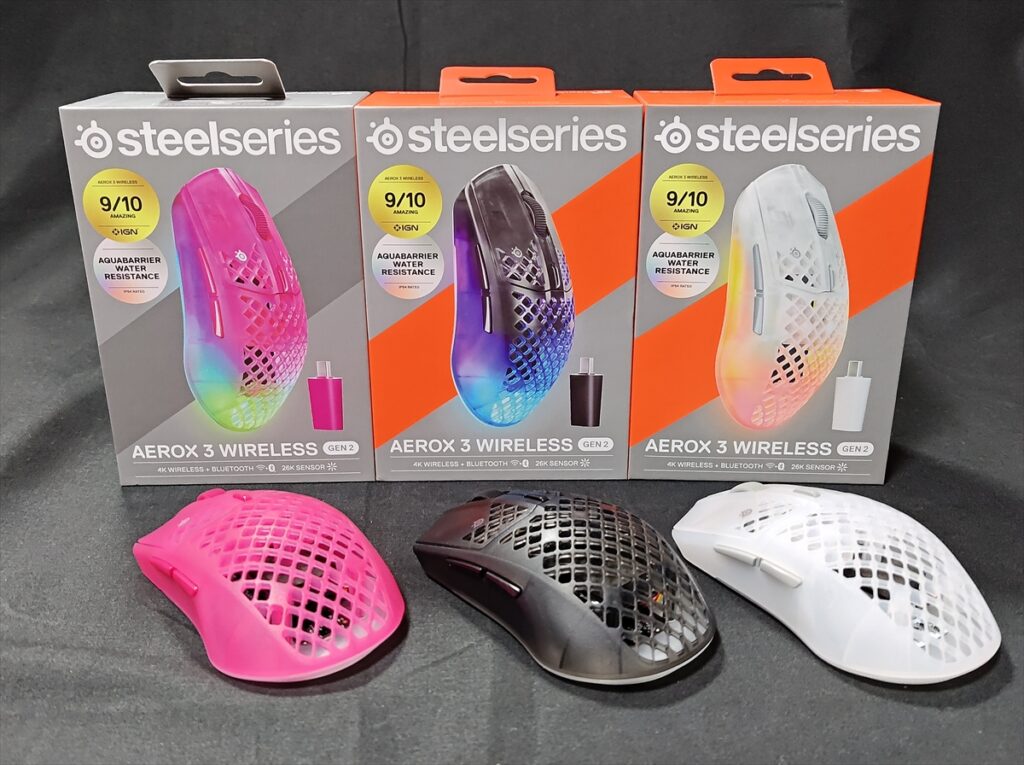 カラーバリエーションは、「Aerox 3 Wireless」のOnyx(オニキス)、Snow(スノー)、Ghost(ゴースト)といった黒、白、白っぽい透明から、Shadow(シャドー)、Ghost(ゴースト)に加えピンクに近いMagenta Haze(マゼンタヘイズ)が加わった。