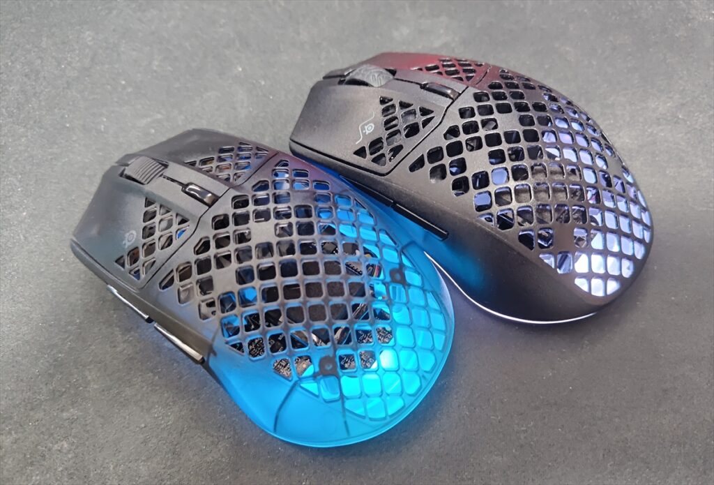 左が「Aerox 3 Wireless Gen 2」、右が「Aerox 3 Wireless」。「Aerox 3 Wireless Gen 2」の方は、マウス下部の素材の透明度が増し、下部全体が光るようなライティングになっている