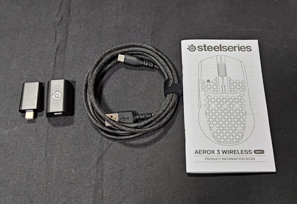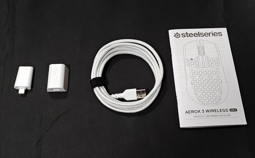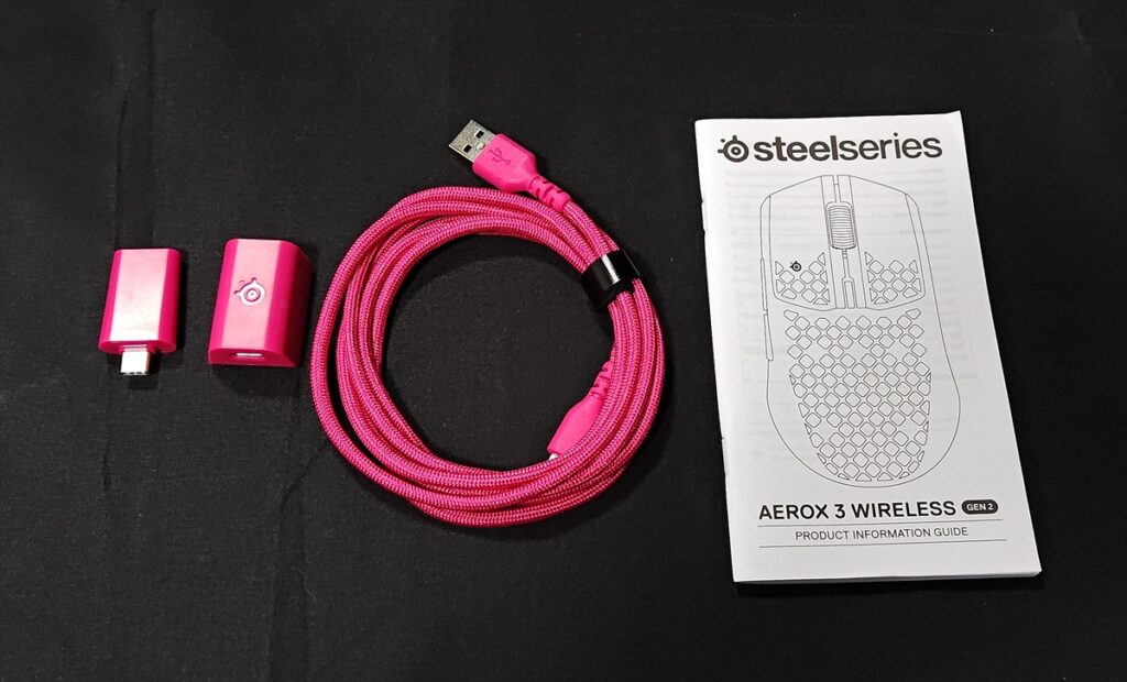 付属品はマニュアルに加え、USB-C 2.4GHz ワイヤレスドングルと、USB Type-C – USB Type-A スーパーメッシュ データ/充電ケーブル(1.8m)、延長アダプター(USB-C ⇔ USB-C)で、それぞれのカラーにあったものを同梱している。