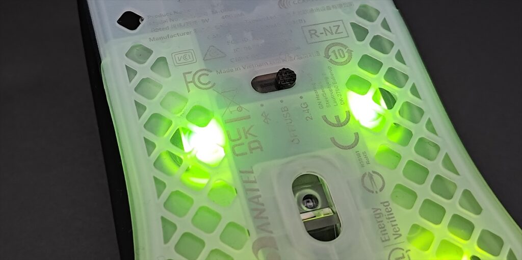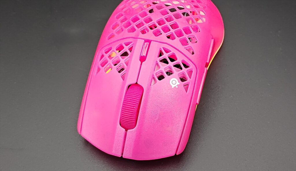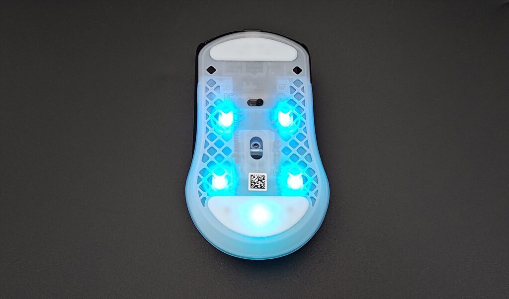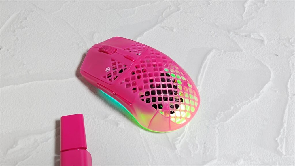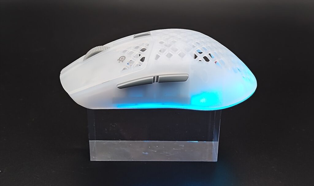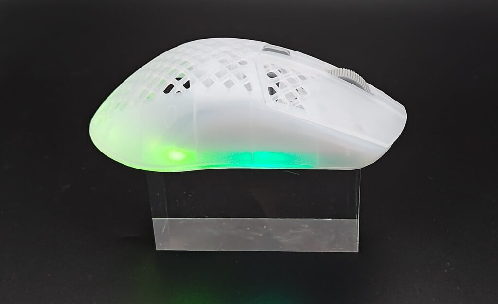 デザインは大きく変わってはいないが、全体的に透明感が増し、より内部のスイッチなどが透けて見えるようになっている。RGBライティングも「Aerox 3 Wireless」は、マウス下部に向かって270°光る仕様だったが、「Aerox 3 Wireless Gen 2」は、360°に広がっている。