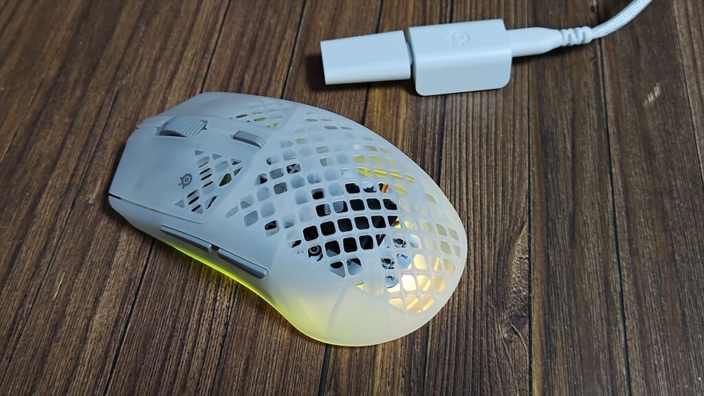 上面のマウスホイールの下にはDPI切り替えスイッチを備える。マウスホイールは、「Aerox 3 Wireless」が軽すぎたが、若干重くなり回した際の抵抗感も若干上がった印象だ。また、IP54の防水・防塵仕様のため、手の汗なども気にせず使用できる。同社の公式サイトでは、水の中で使用したデモ映像があるほどで、完全防水ではないものの、誤って水の中に落としたらすぐに壊れることがない程度の防水性能はあるようだ。