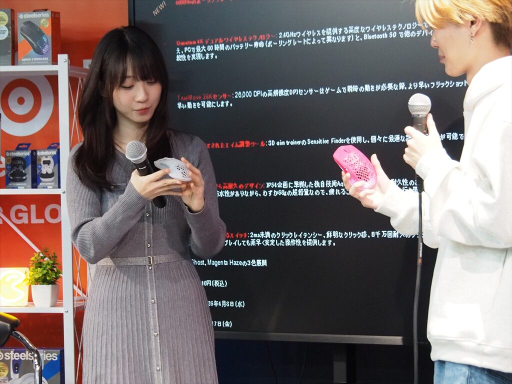「Aerox 3 Wireless Gen 2」の紹介時には、最初伊織さんにMagenta Hazeが手渡されたが、伊織さんは白い製品が好き、さはらさんがMagenta Hazeが気にいったとして交換する場面も。