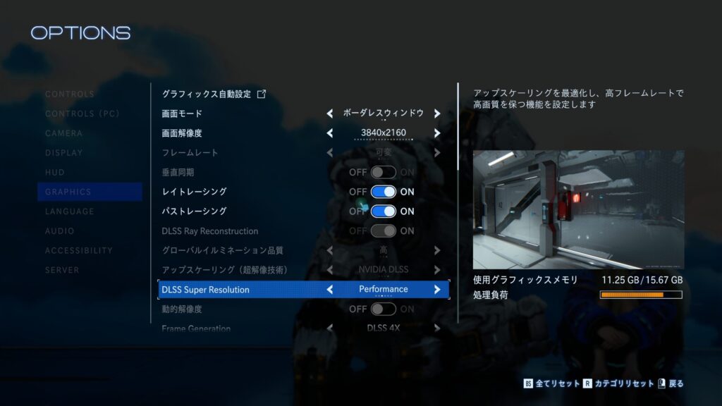 まずは、映像の比較から見ていきたい。冒頭の月震に巻き込まれる前の基地の外が大きなガラス壁から望めるシーンで比較。グラフィック設定は以下のとおり、すべての設定を最高設定にし、モーションブラーなどはすべて有効。DLSSの設定だけは「Perfomance」にしている。
