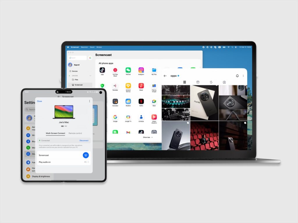 PCにOPPOスマホの画面をミラーリングして、PC画面上でスマホのアプリ起動や、キーボードショートカットで快適に操作できる。ルミナスレンダリングエンジンの搭載で、システムモジュールそれぞれの処理が同時に行われるため、画面の動きが滑らかでタッチした瞬間に反応。