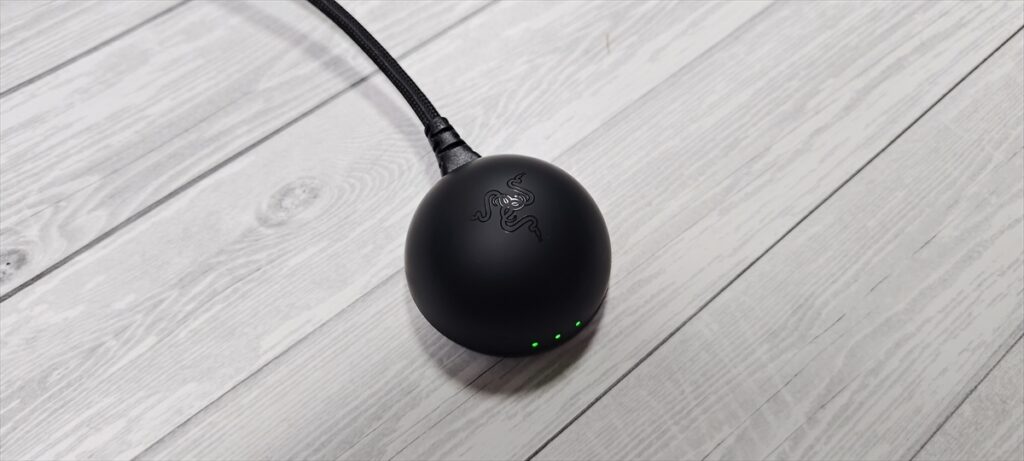 最近のマウスのなかには、底面にUSBドングルを収納できるタイプもあるが、軽量を追及しているモデルということもあって、余分なものは極力排除されているため、ドングルの収納はできない。また、ドングルはUSBメモリのような形状が一般的で、Viper V3 Proも台形のような形状をしていたが、丸型の形状に再設計されている。