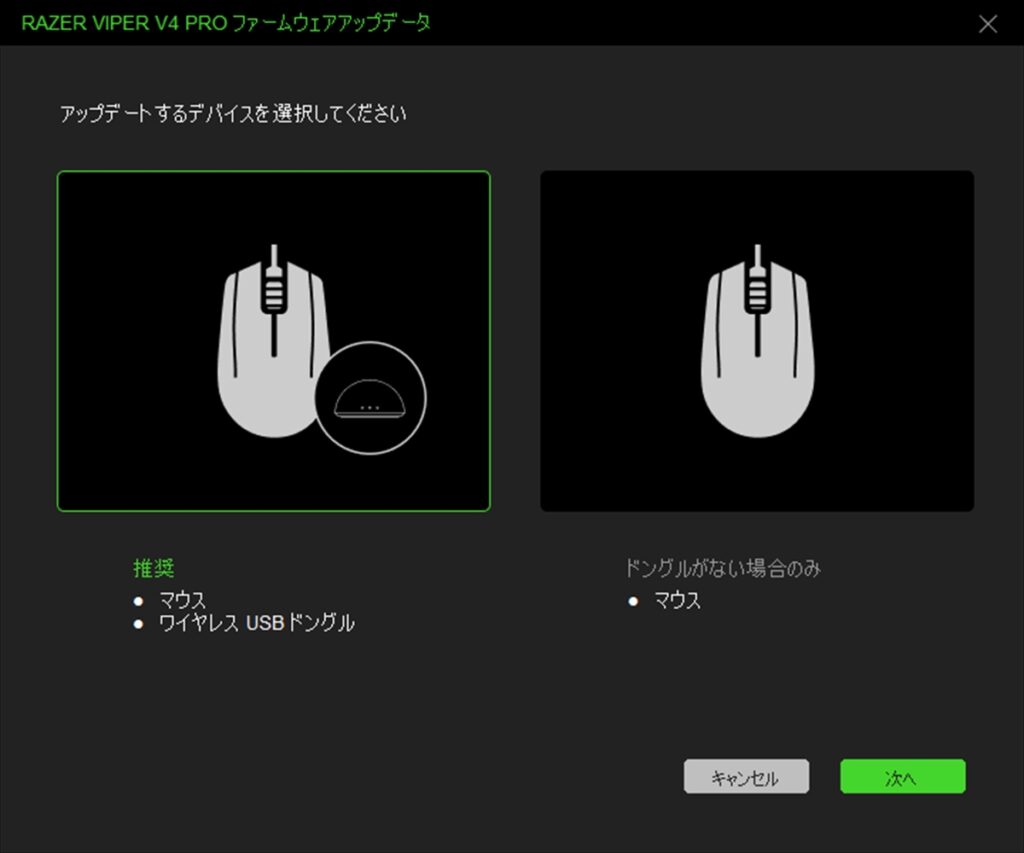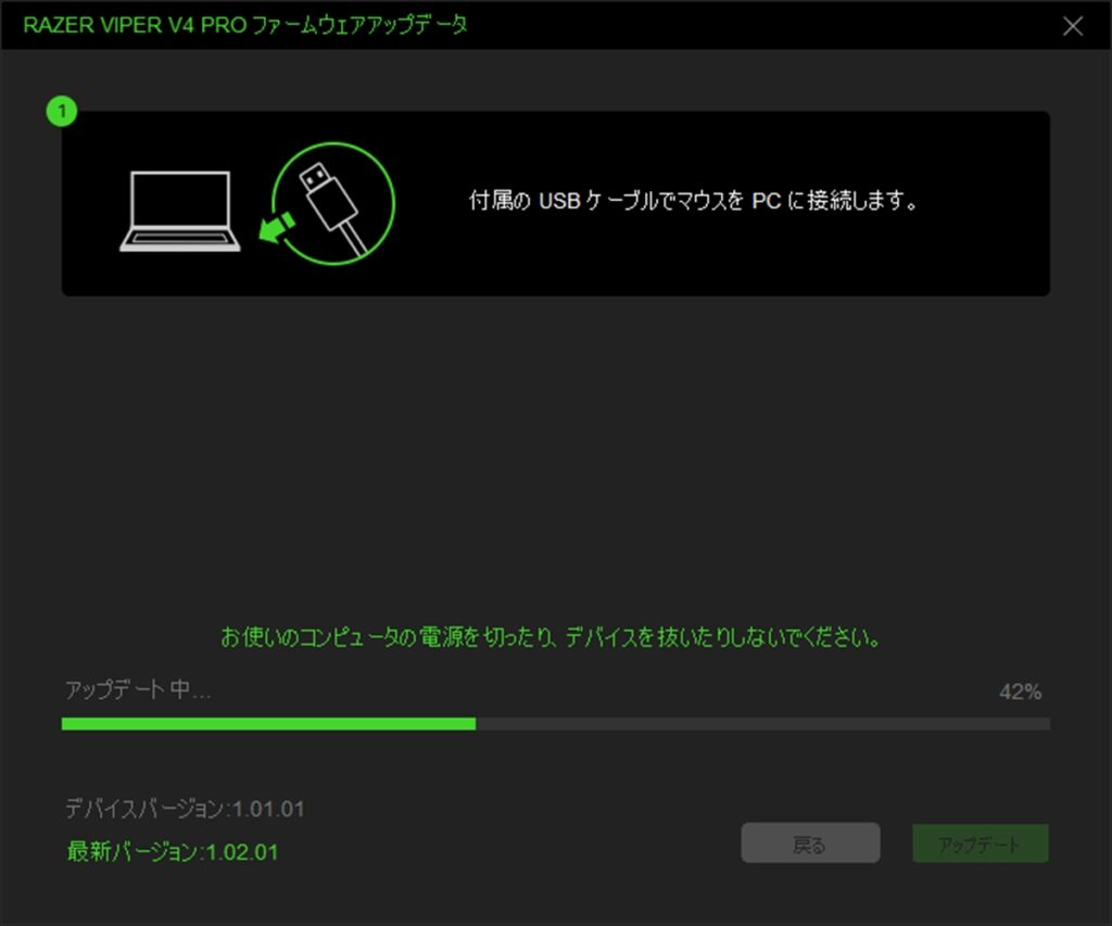 また、ファームウェアのアップデートがあれば促され、以下のように画面の指示通りに進めるだけでアップデートも完了する。イラスト付きで丁寧に説明されるので、初めてゲーミングマウスを買う人でも安心だ。