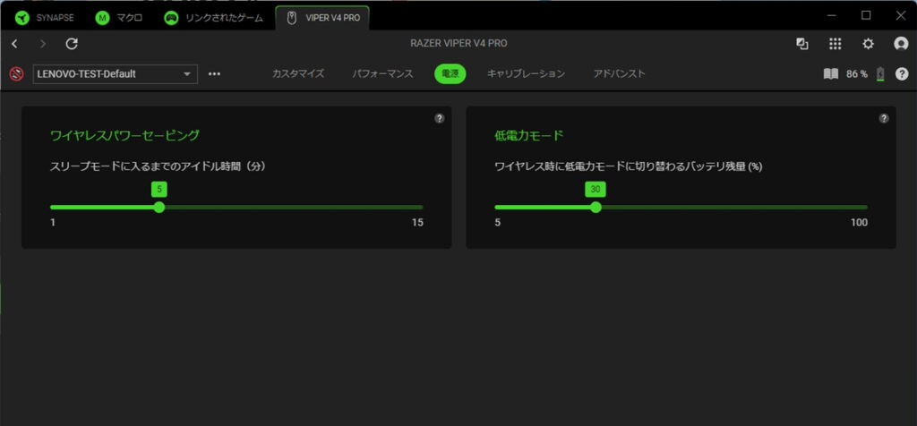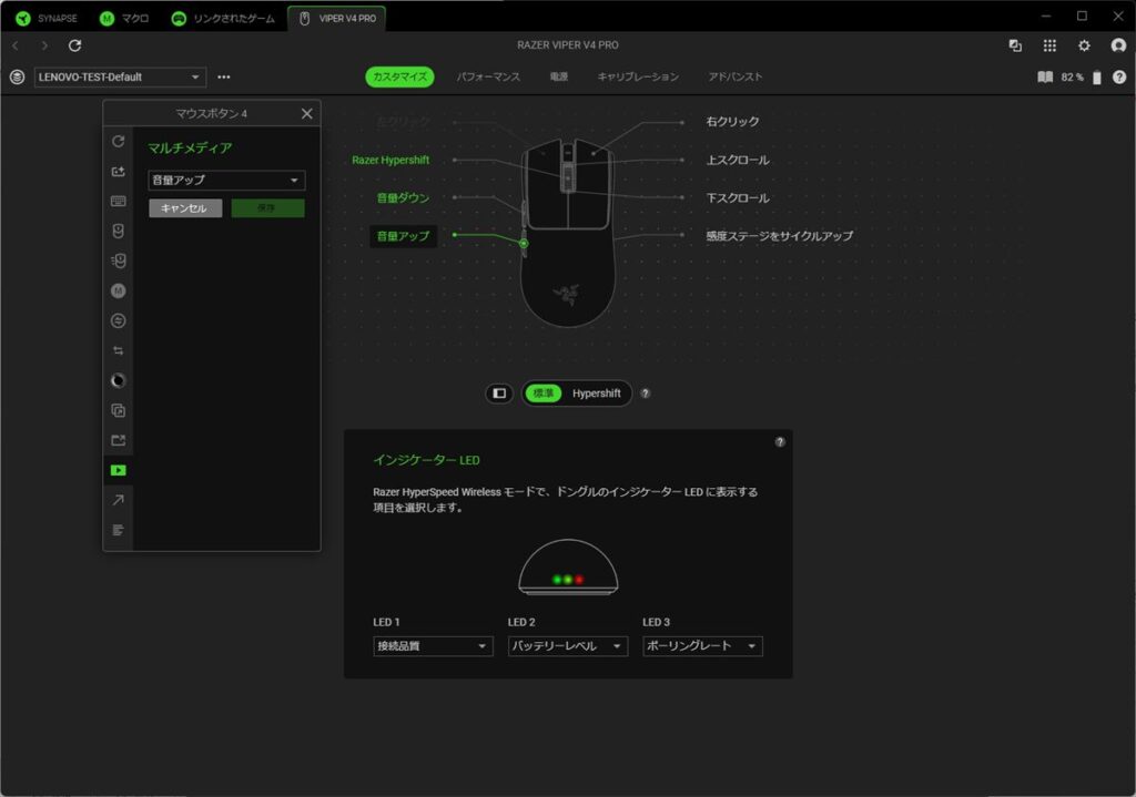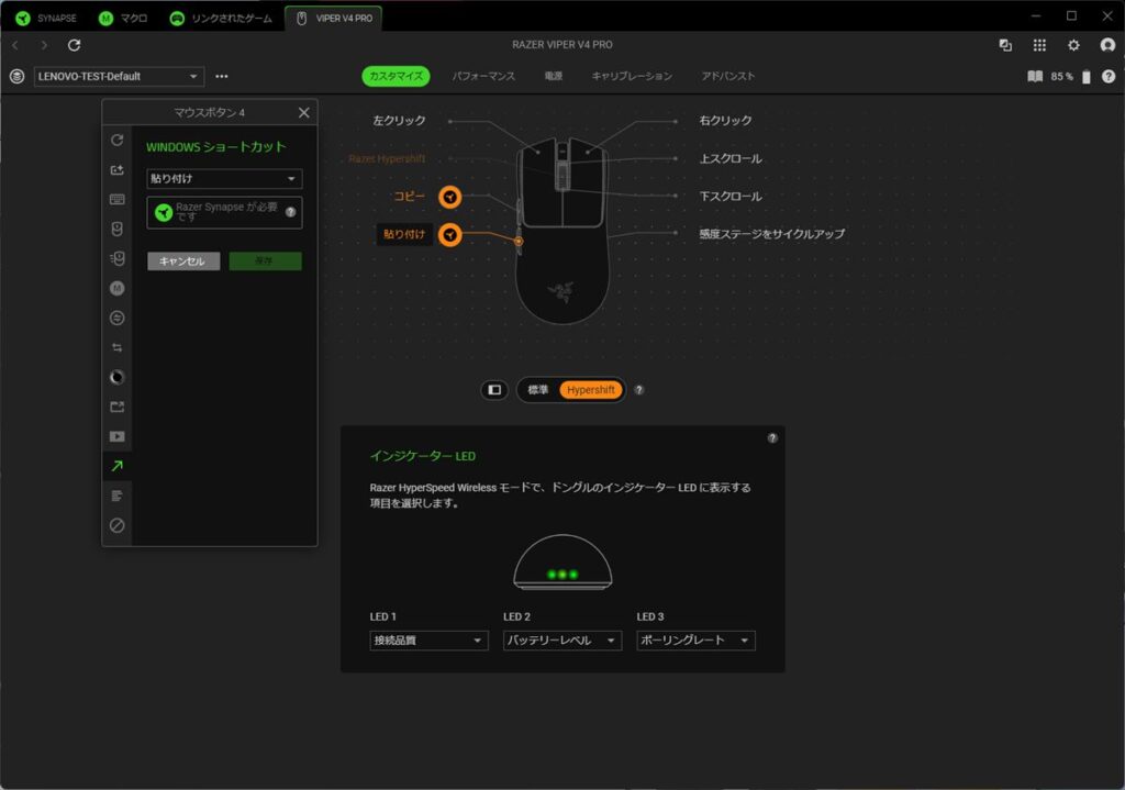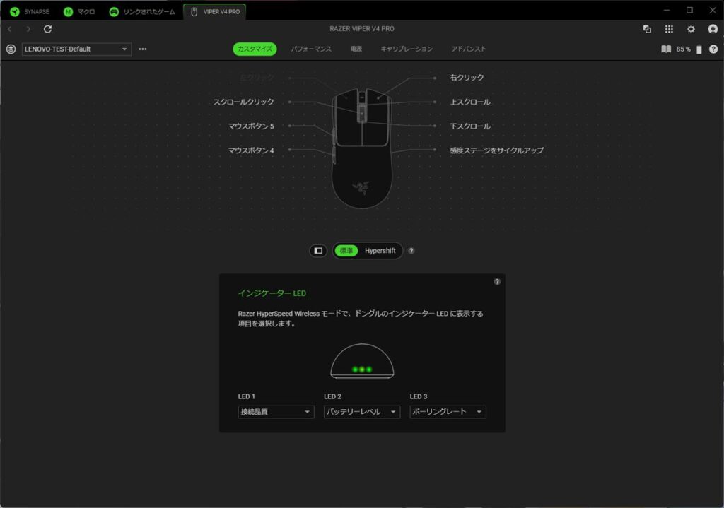 「Razer Synapse 4」では、マウスのボタン機能のカスタマイズや、感度、ポーリングレートの変更どが行なえる。同社のLED同期技術「Chroma RGB」に対応するマウスやキーボードは、LEDライティングの設定も行なえるが、Viper V4 Proは軽量ゆえにライティングはインジケーターのみなので、項目自体がない。