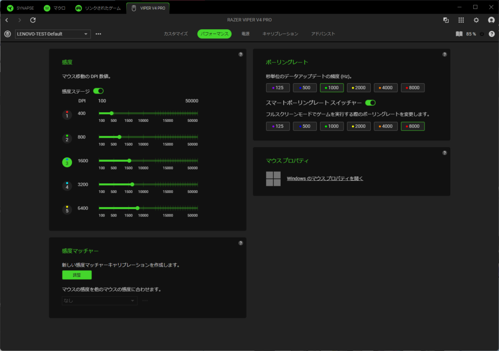 パフォーマンスタブでは、感度(DPI)やポーリングレートが設定できる。「スマートポーリングレートスイッチャー」を有効にすると、フルスクリーンでゲームが起動した際には、ポーリングレートが切り替わる。ゲームを起動していない時は1000Hz、ゲーム起動時は8000Hzに自動で変えたい場合に使用する。