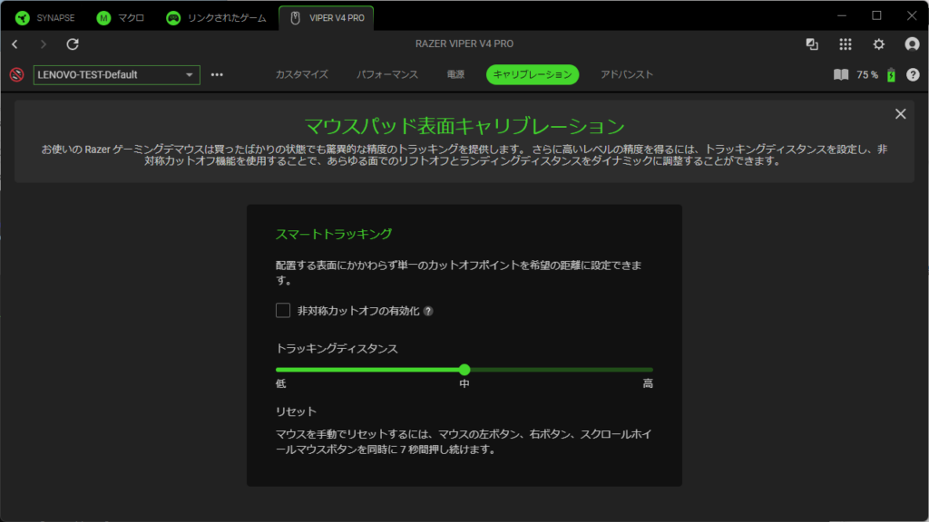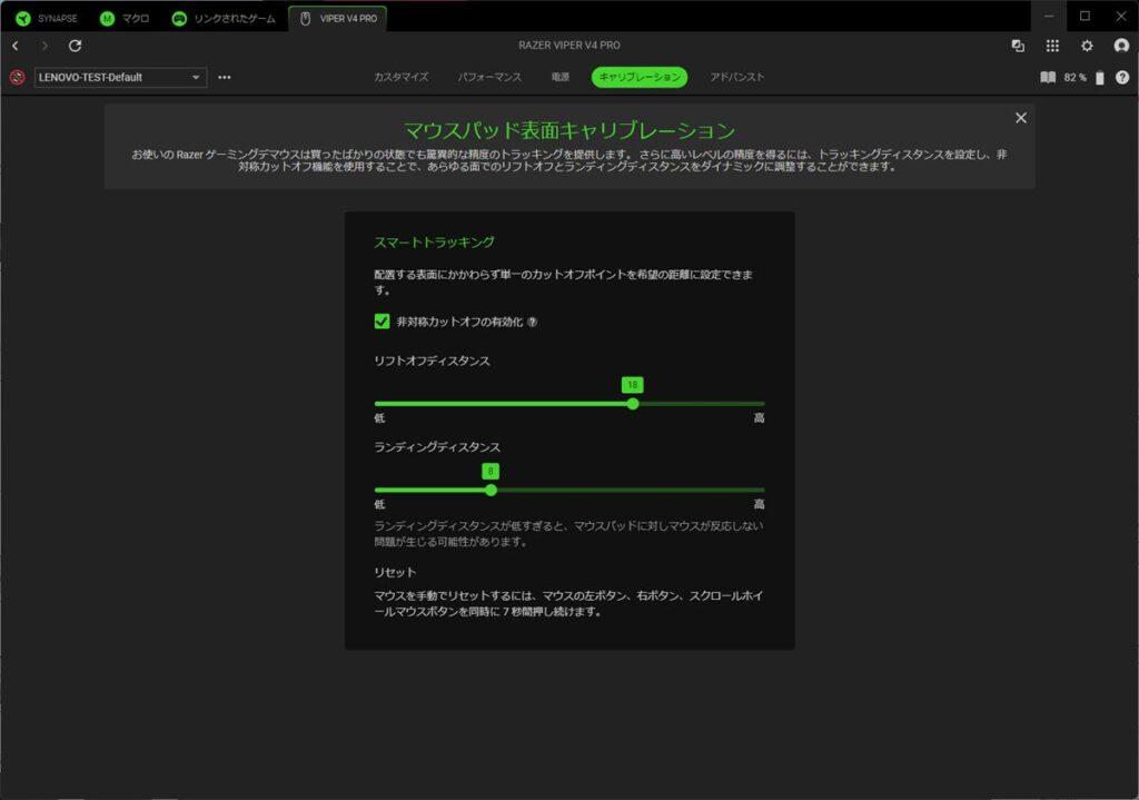 「非対称カットオフの有効化」を有効にすると、マウスをどれだけマウスパッドに近づけたら反応するかの「ランディングディスタンス」が追加されて、細かく数値で調整できる。