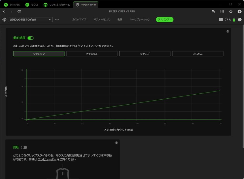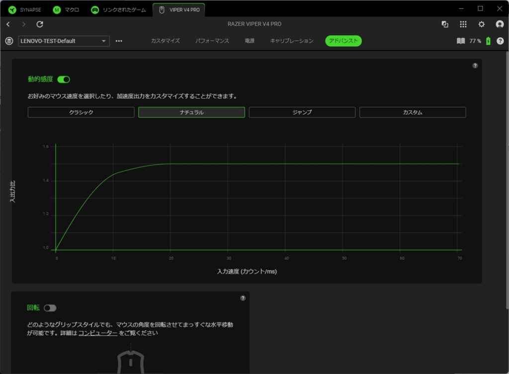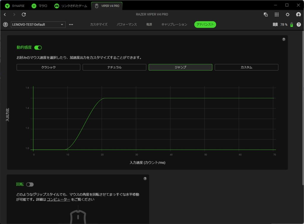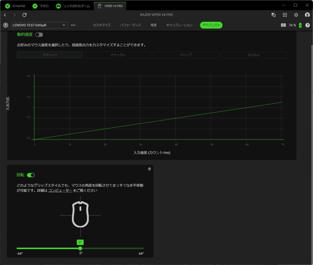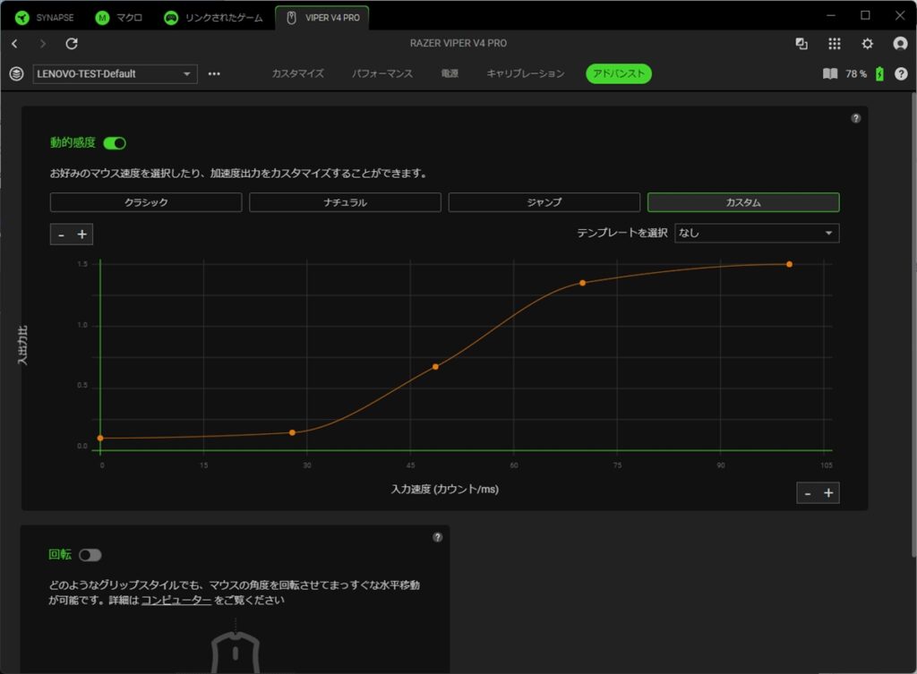 アドバンストタブでは、マウスの加速度や、センサーの角度調整が行える。加速度を変えると、マウスを動かした際のカーソルの速度が、ラインチャートに合わせて変わる。ゲームで使う人はあまり聞かないが、たとえば端にいる敵にカーソルを合わせようとすると、大きくマウスを動かす必要がある。