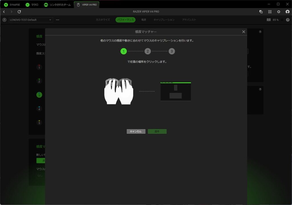 また、感度マッチャーでは、ほかのマウスを並べて画面指示に従うだけで、ほかのマウスの感度設定などを引き継げる。