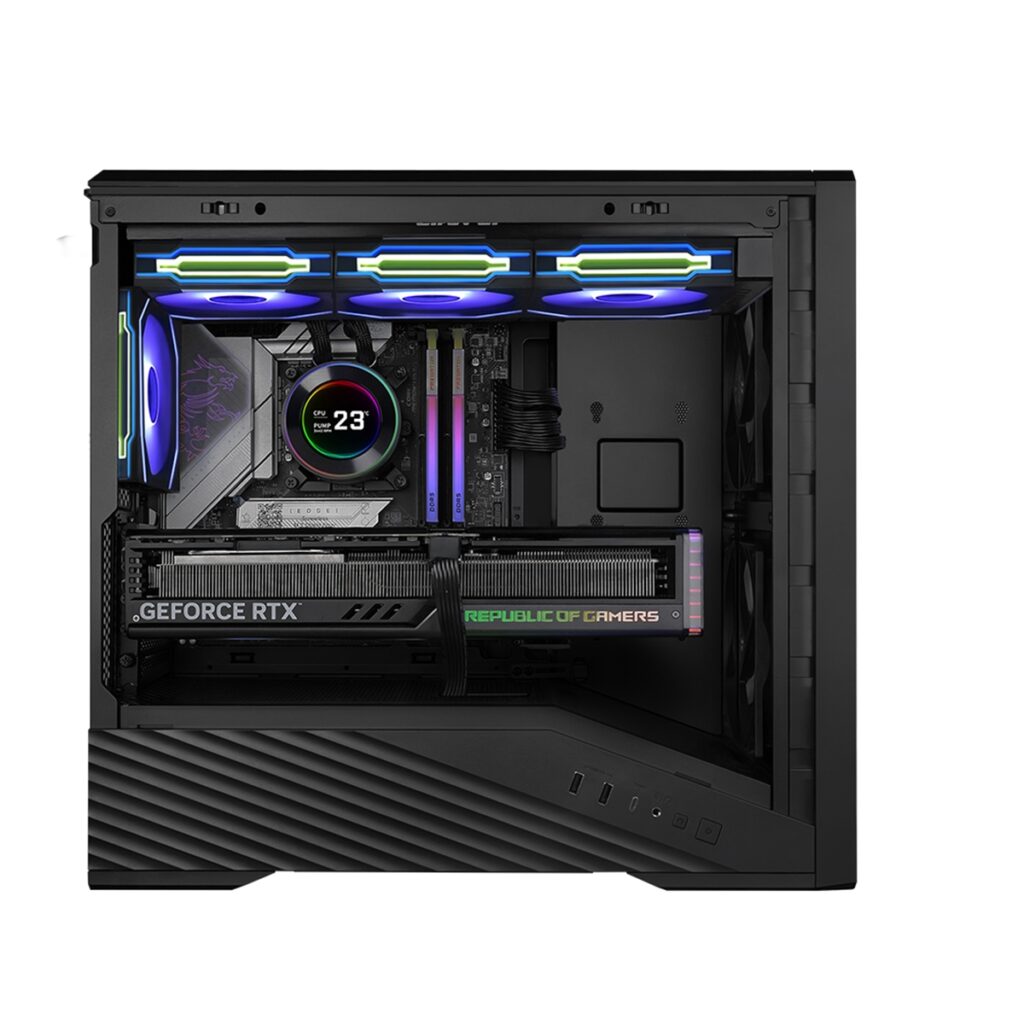 印象的なインフィニティミラーのフロントパネルと、インフィニティミラーハブを備えた140mm ARGBファンを2基フロントに標準搭載し、コンパクトな筐体ながら、華やかなルックスと強力なエアフローを実現している。