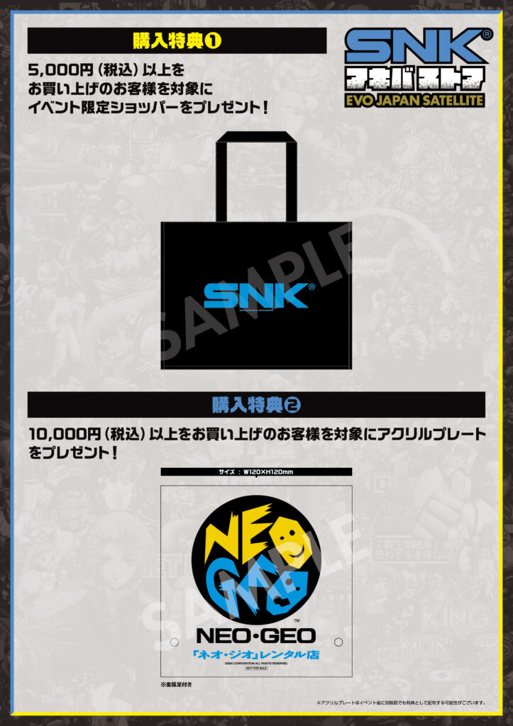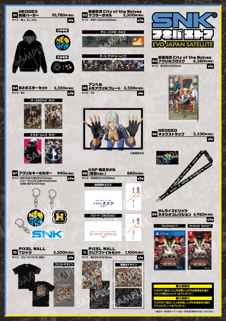 SNKブース内に設置された物販スペース「SNK アキバストア EVO JAPAN SATELLITE」において公式グッズの販売を実施。本イベントのために用意されたグッズのほか、「SNK アキバストア」で人気の商品、掘り出し商品のゲームソフトなどが販売されるとのこと。
