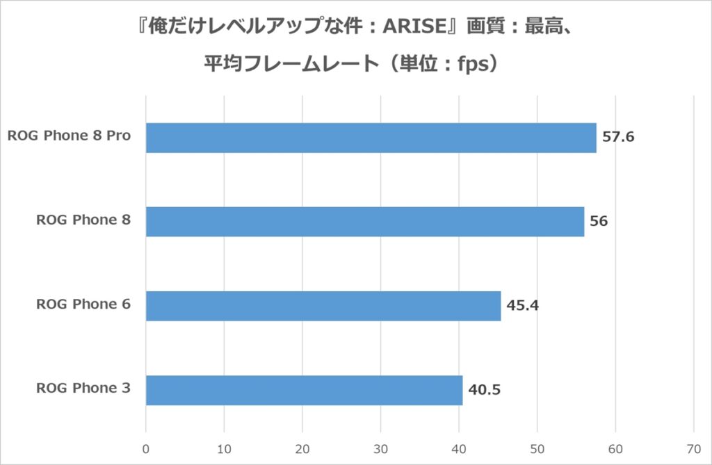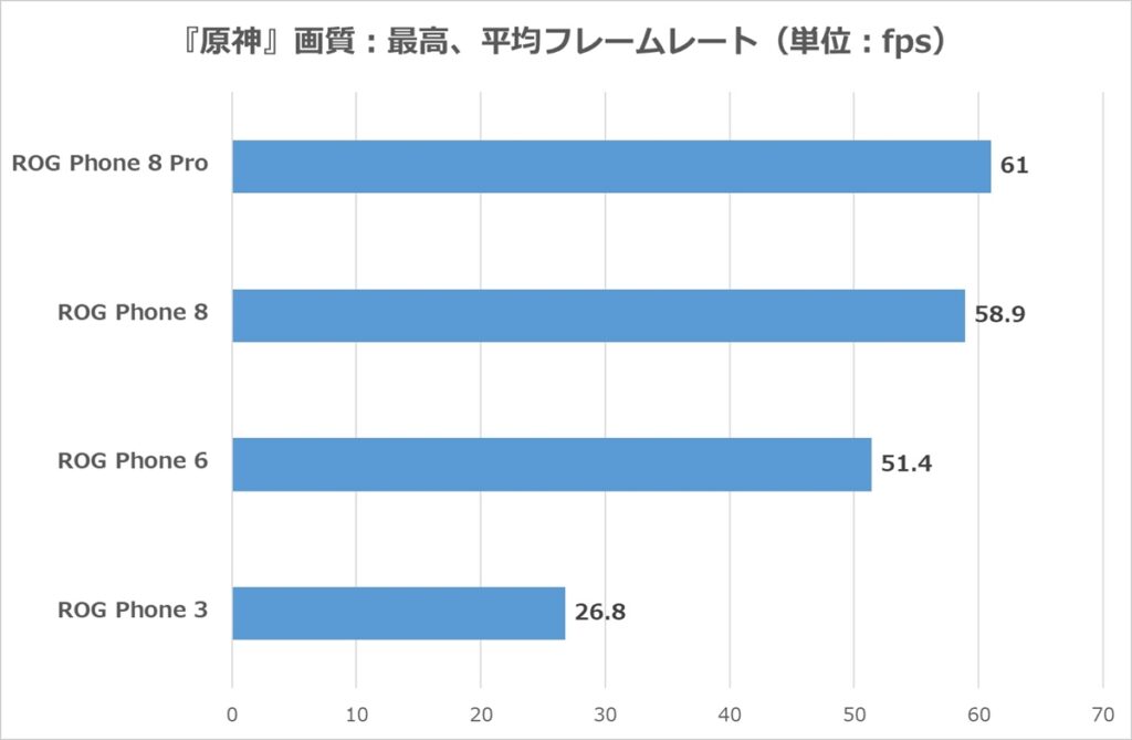 しかしながらROG Phone 8は、そのROG Phone 3の倍以上の平均フレームレートを出しているので、ゲームによっては高リフレッシュレートを活かせる性能を有しているのが分かる。