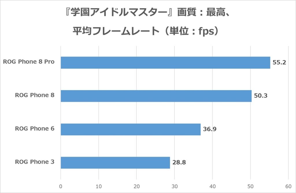 シーンによるのかクーラー付きのROG Phone 8 Proでも平均55.2fpsと、60fps貼り付きという訳にはいかなかった。ROG Phone 3では28.8fpsと30fpsを切っている。それでも画面がカク付いてどうにもならない、といった感じではないので遊べなくはないが、画面がカク付いて気になるようなら画質は落とした方が良い。