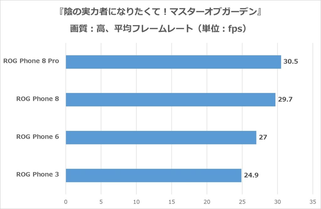 『カゲマス』の最大フレームレートは30なので、ROG Phoen 8 Proは完全に30で貼り付いている。ROG Phone 6では27fps、ROG Phone 3で24.9fpsと、時々落ちるフレームレートの差がはっきりと性能差に現れているが、特段気になる差ではないので、4年前くらいのハイエンドスマホなら十分に「高」設定で遊べそうだ。