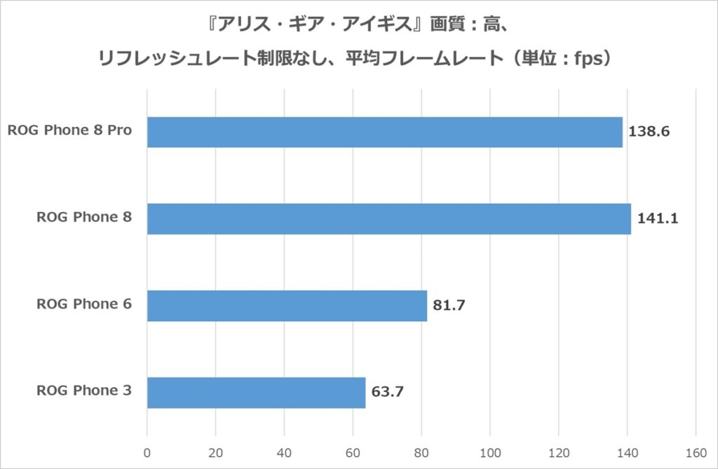 一方で、ROG Phone 3でも平均63.7fpsと60fpsを超えている。『アリス・ギア・アイギス』は6年前に配信が開始されたゲームなので、当時発売されたROG Phone 3の動作としては当たり前なのかもしれないが、さすがゲーミングスマホといったところ。