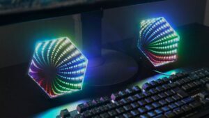 『卓上RGBミラー』は奥行き感のある光を生み出すLED搭載の卓上&壁掛けミラーだ。本製品は六角形のデザインを採用し、サイズは15.5(W)×3.5(D)×13.5(H)cmで、重さが約170gとなっている。