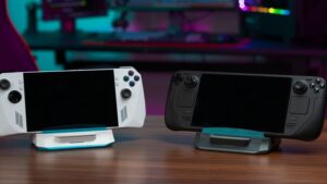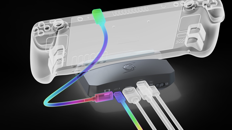 本体にはスリットがあり、最近増えているゲーム機型PCに取り付けも可能。同社は対応製品は明らかにしていないが、公開された写真からSteam DeckとROG Allyは利用できるようだ。ROG Allyよりも幅のある、ROG Ally XやLegion Goなどでも使えるかが気になるところ。